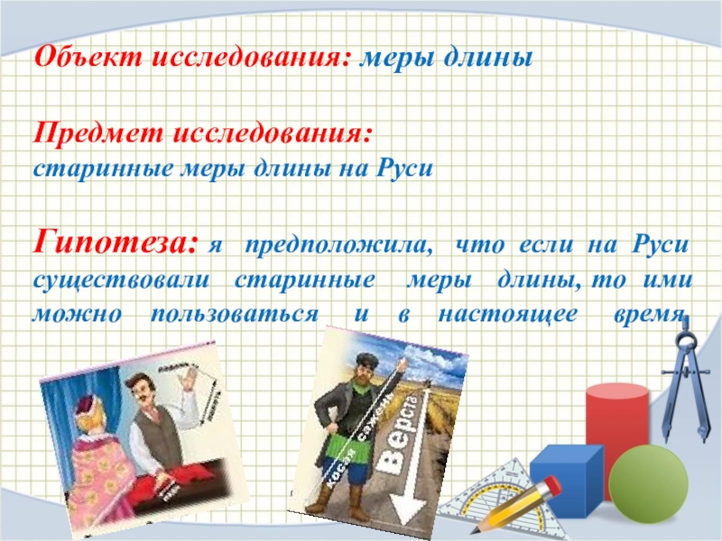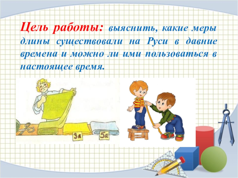Слайд 9Цель работы: выяснить, какие меры длины существовали на Руси в давние