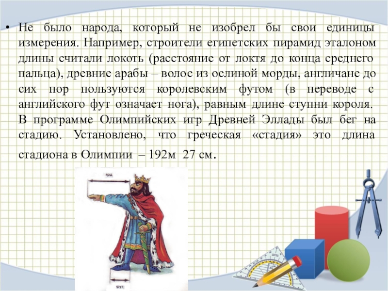 строители египетских пирамид эталоном длины считали локоть (расстояние от локтя до конца среднего пальца), древние арабы – волос из ослиной морды, англичане до сих пор пользуются королевским футом (в переводе с английского фут означает нога), равным длине ступни короля. В программе Олимпийских игр Древней Эллады был бег на стадию. Установлено, что греческая «стадия» это длина стадиона в Олимпии – 192м 27 см.
