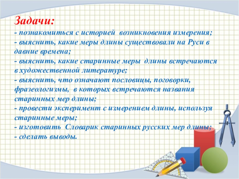 - выяснить, что означают пословицы, поговорки, фразеологизмы, в которых встречаются названия старинных мер длины;