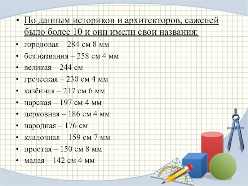 Слайд 26По данным историков и архитекторов, саженей было более 10 и они