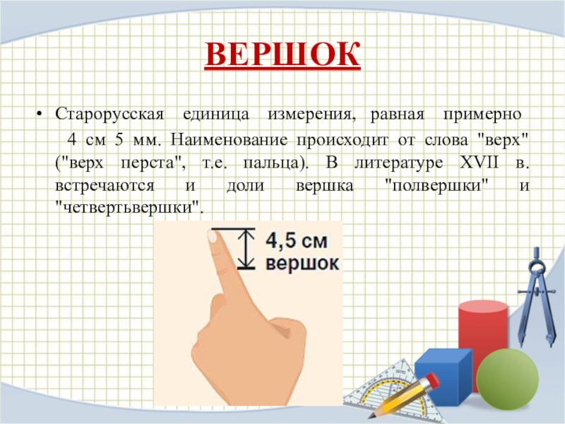 4 см 5 мм. Наименование происходит от слова "верх" ("верх перста", т.е. пальца). В литературе XVII в. встречаются и доли вершка "полвершки" и "четвертьвершки".