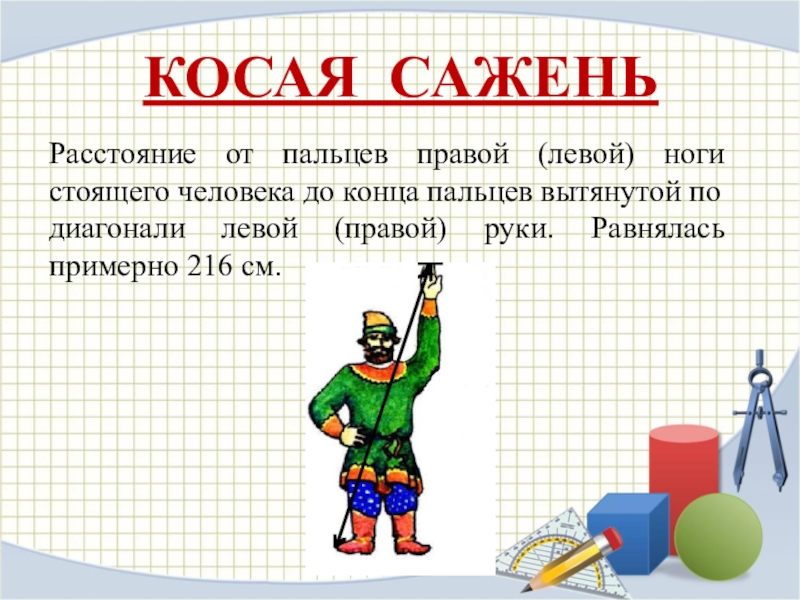 пальцев вытянутой по диагонали левой (правой) руки. Равнялась примерно 216 см.