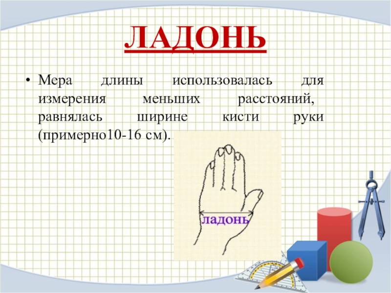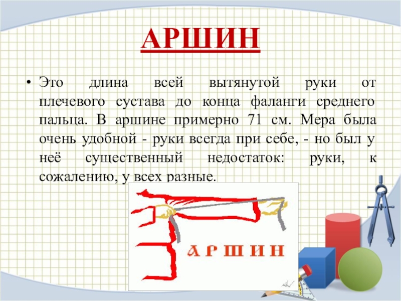 среднего пальца. В аршине примерно 71 см. Мера была очень удобной - руки всегда при себе, - но был у неё существенный недостаток: руки, к сожалению, у всех разные.