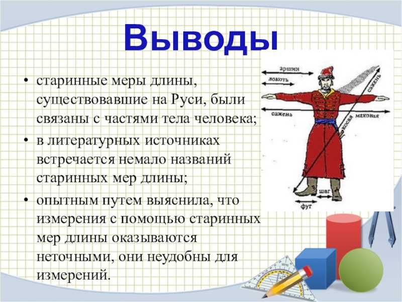 опытным путем выяснила, что измерения с помощью старинных мер длины оказываются неточными, они неудобны для измерений.