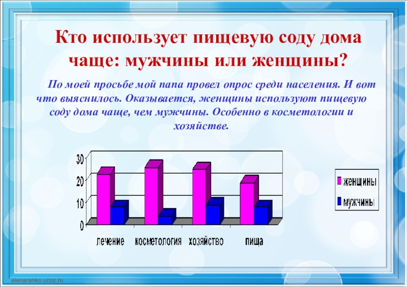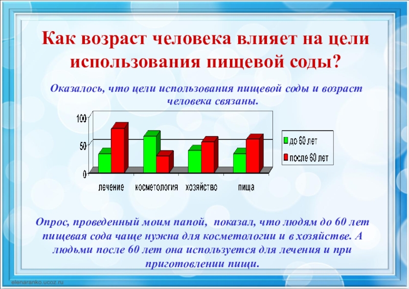 Опрос, проведенный моим папой, показал, что людям до 60 лет пищевая сода чаще нужна для косметологии и в хозяйстве. А людьми после 60 лет она используется для лечения и при приготовлении пищи.