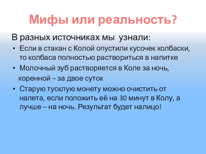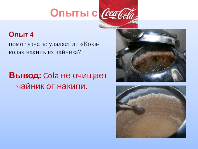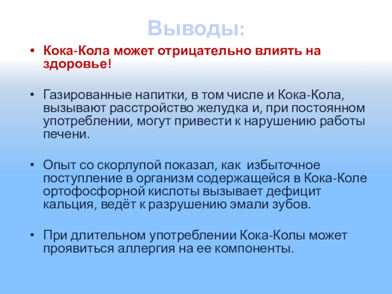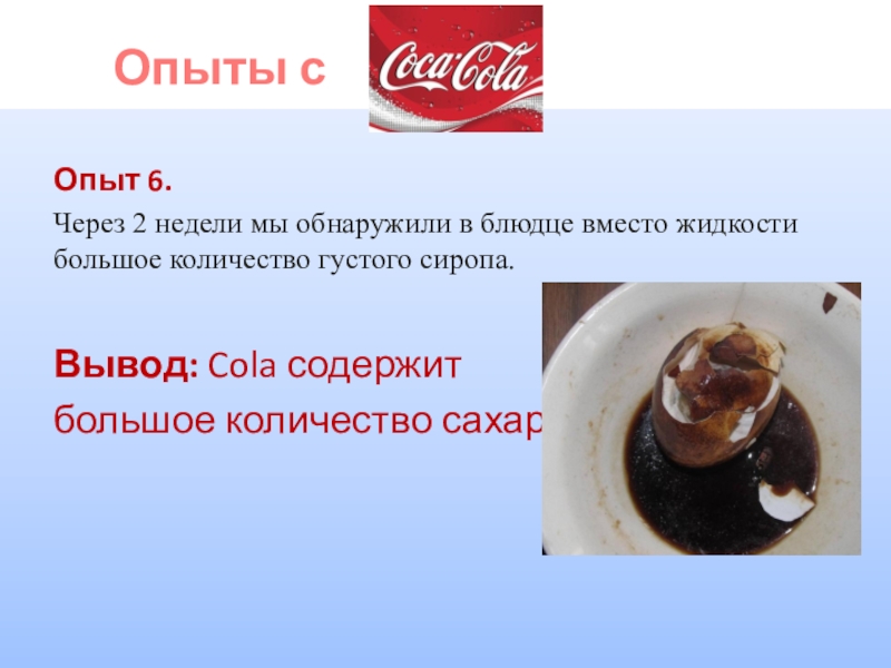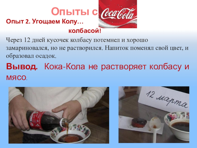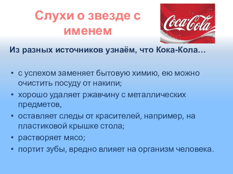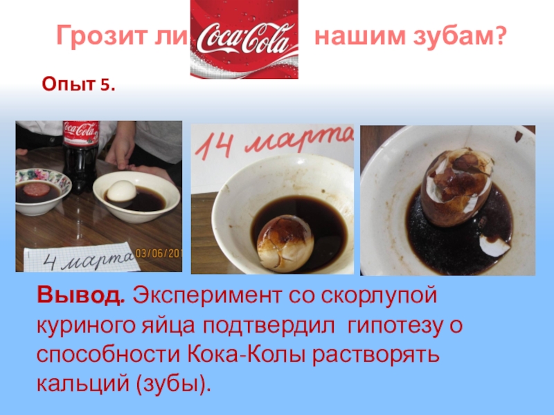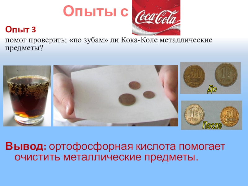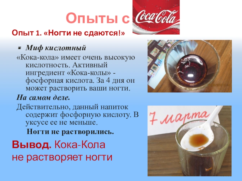 «Кока-кола» имеет очень высокую кислотность. Активный ингредиент «Кока-колы» - фосфорная кислота. За 4 дня он может растворить ваши ногти.