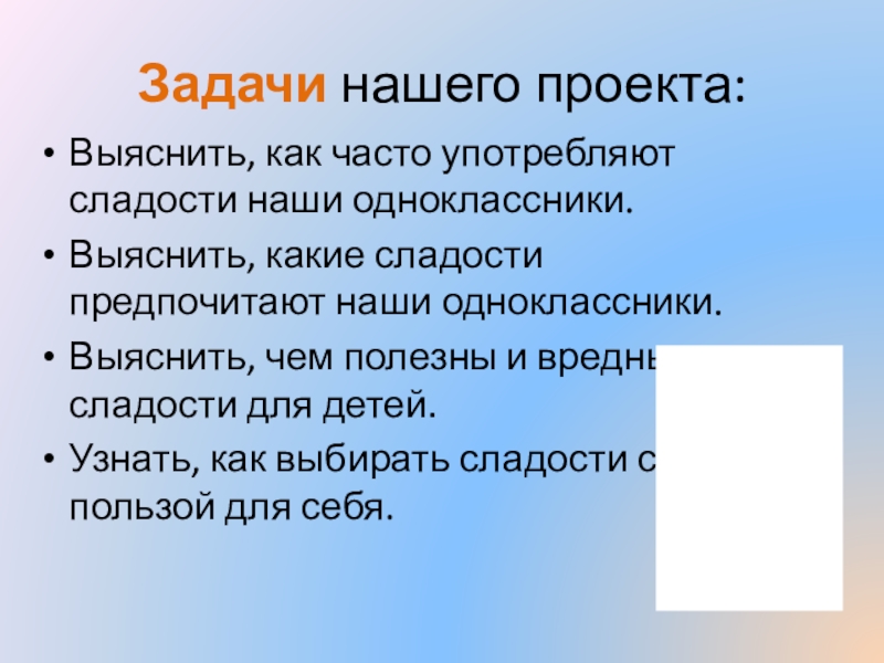 Выяснить, чем полезны и вредны сладости для детей.