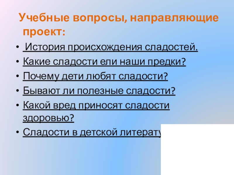 Слайд 6 Учебные вопросы, направляющие проект: