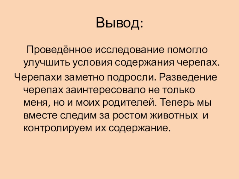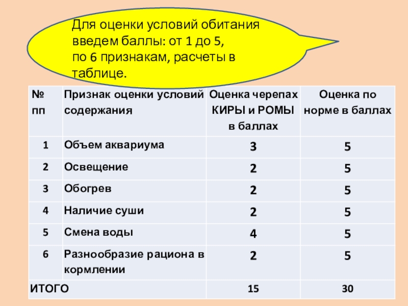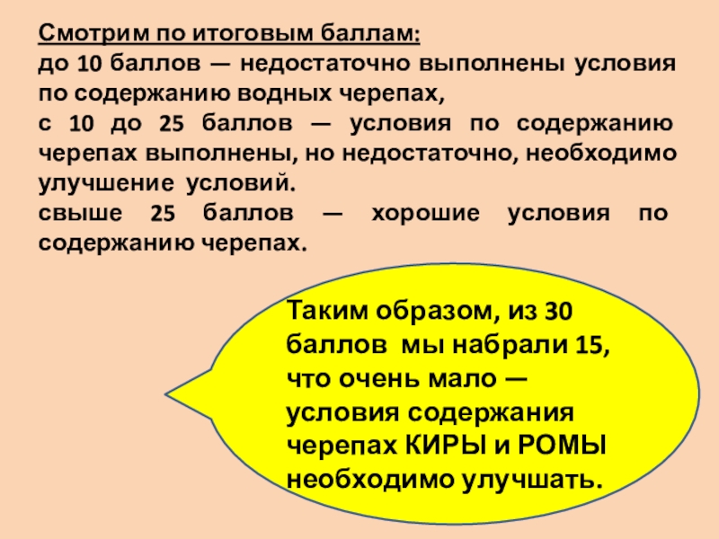 Таким образом, из 30 баллов мы набрали 15, что очень мало — условия содержания черепах КИРЫ и РОМЫ необходимо улучшать.