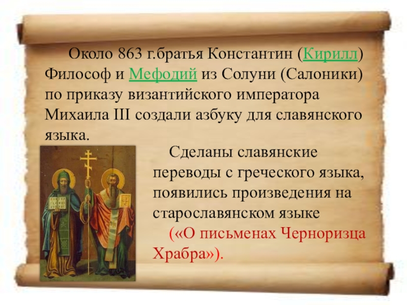 Сделаны славянские переводы с греческого языка, появились произведения на старославянском языке