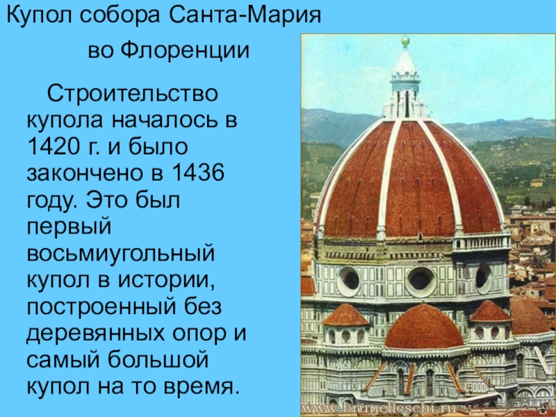 Строительство купола началось в 1420 г. и было закончено в 1436 году. Это был первый восьмиугольный купол в истории, построенный без деревянных опор и самый большой купол на то время.