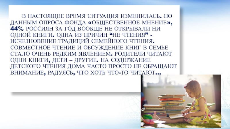 фонда «Общественное мнение», 44% россиян за год вообще не открывали ни одной книги. Одна из причин “не чтения” - исчезновение традиций семейного чтения. Совместное чтение и обсуждение книг в семье стало очень редким явлением. Родители читают одни книги, дети – другие. На содержание детского чтения дома часто просто не обращают внимание, радуясь, что хоть что-то читают…