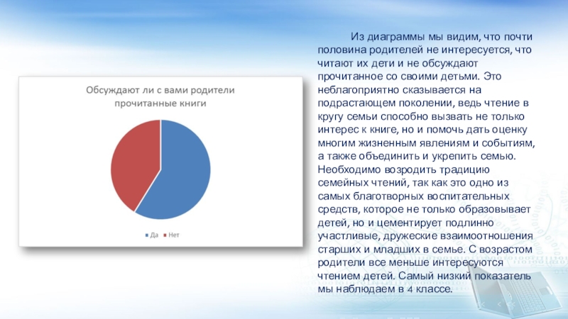 почти половина родителей не интересуется, что читают их дети и не обсуждают прочитанное со своими детьми. Это неблагоприятно сказывается на подрастающем поколении, ведь чтение в кругу семьи способно вызвать не только интерес к книге, но и помочь дать оценку многим жизненным явлениям и событиям, а также объединить и укрепить семью. Необходимо возродить традицию семейных чтений, так как это одно из самых благотворных воспитательных средств, которое не только образовывает детей, но и цементирует подлинно участливые, дружеские взаимоотношения старших и младших в семье. С возрастом родители все меньше интересуются чтением детей. Самый низкий показатель мы наблюдаем в 4 классе.