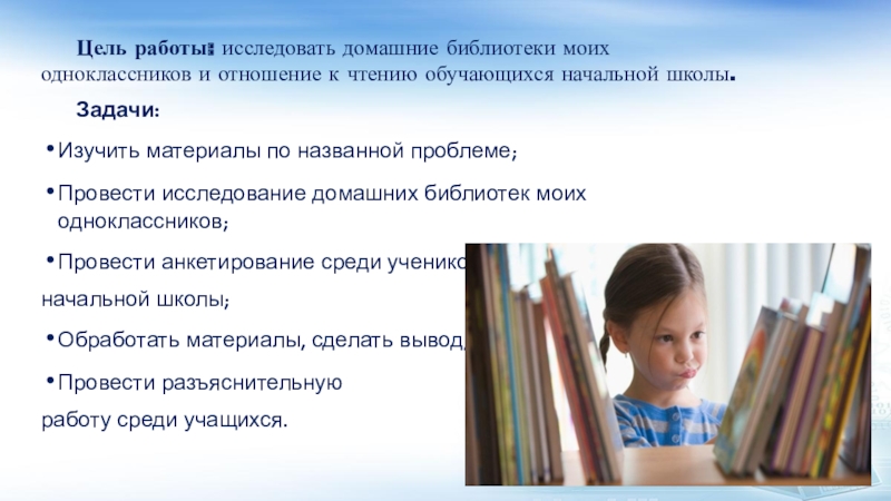 Слайд 4 Цель работы: исследовать домашние библиотеки моих одноклассников и