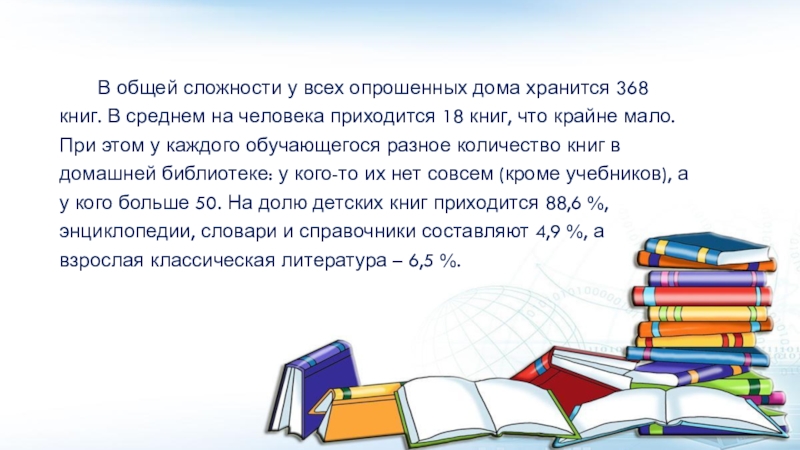 хранится 368 книг. В среднем на человека приходится 18 книг, что крайне мало. При этом у каждого обучающегося разное количество книг в домашней библиотеке: у кого-то их нет совсем (кроме учебников), а у кого больше 50. На долю детских книг приходится 88,6 %, энциклопедии, словари и справочники составляют 4,9 %, а взрослая классическая литература – 6,5 %.