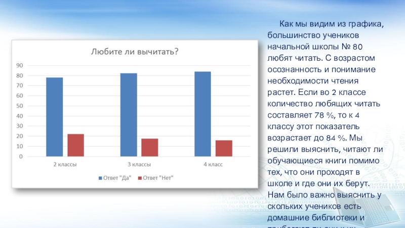 школы № 80 любят читать. С возрастом осознанность и понимание необходимости чтения растет. Если во 2 классе количество любящих читать составляет 78 %, то к 4 классу этот показатель возрастает до 84 %. Мы решили выяснить, читают ли обучающиеся книги помимо тех, что они проходят в школе и где они их берут. Нам было важно выяснить у скольких учеников есть домашние библиотеки и прибегают ли они к их помощи.