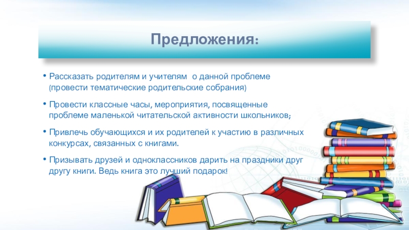 Провести классные часы, мероприятия, посвященные проблеме маленькой читательской активности школьников;