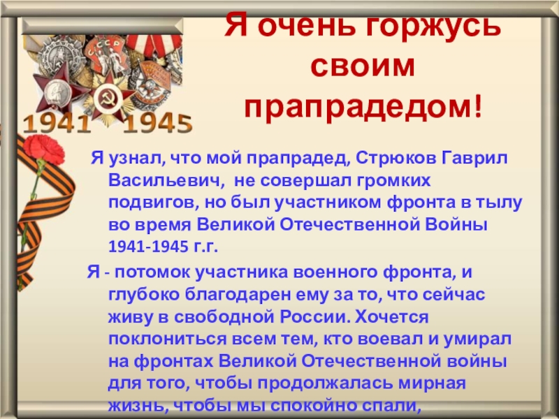 Систематизировать и обработать собранный материал о моем прапрадедушке Стрюкове Г.В.