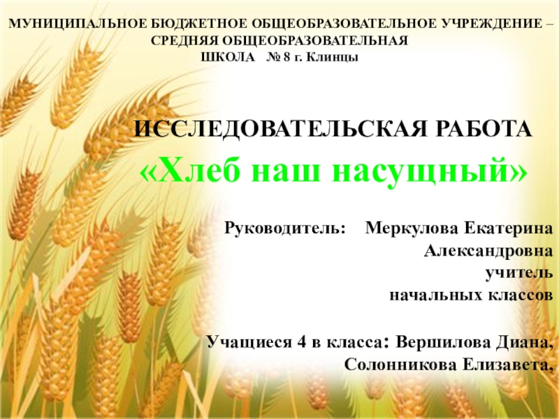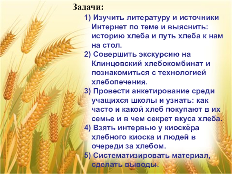 1) Изучить литературу и источники Интернет по теме и выяснить: историю хлеба и путь хлеба к нам на стол.