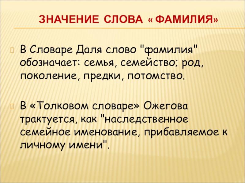 Слайд 3ЗНАЧЕНИЕ СЛОВА « ФАМИЛИЯ»