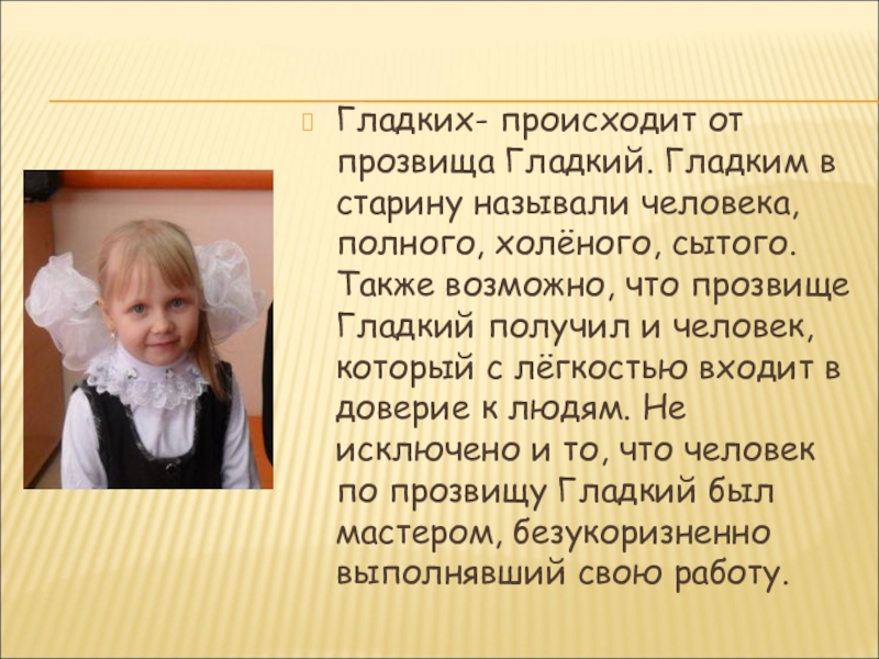 Слайд 11Гладких- происходит от прозвища Гладкий. Гладким в старину называли человека, полного,