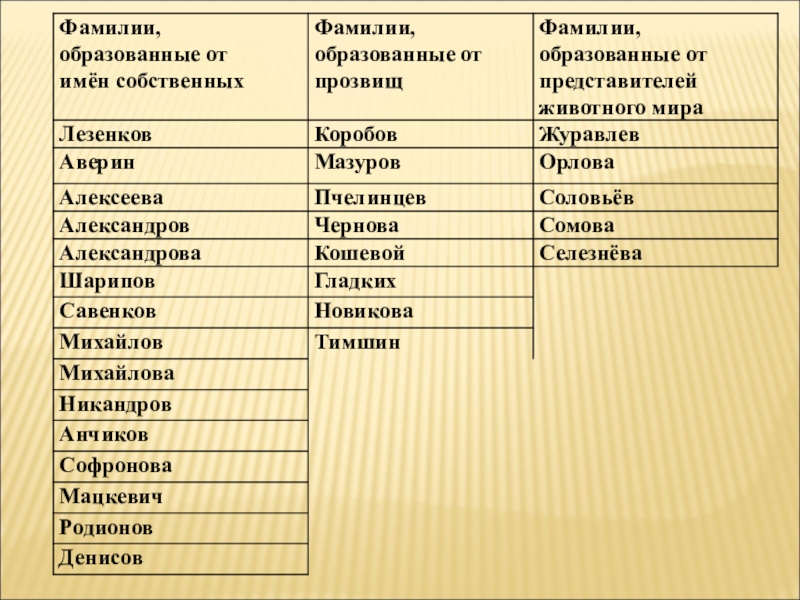 6.Фамилии, образованные от представителей животного мира: Оленёвы, Журавлёвы, Соловьёвы.