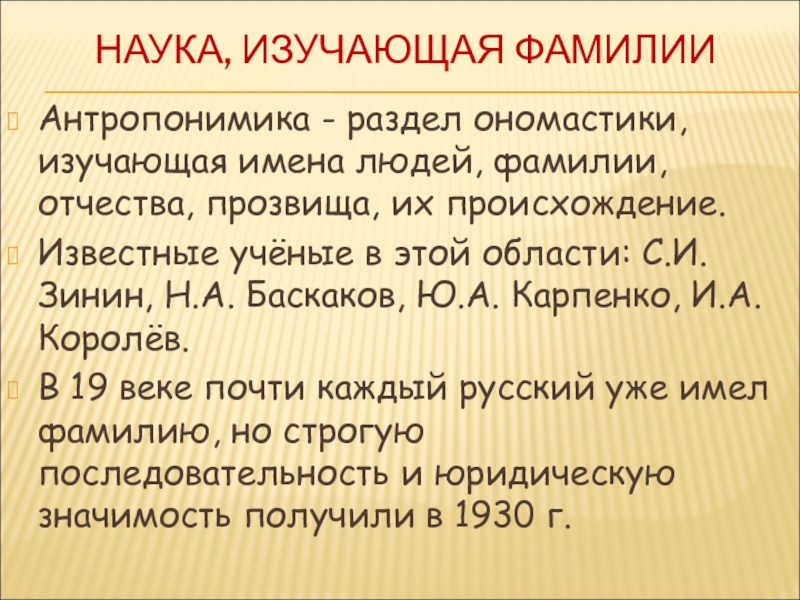 Антропонимика - раздел ономастики, изучающая имена людей, фамилии,