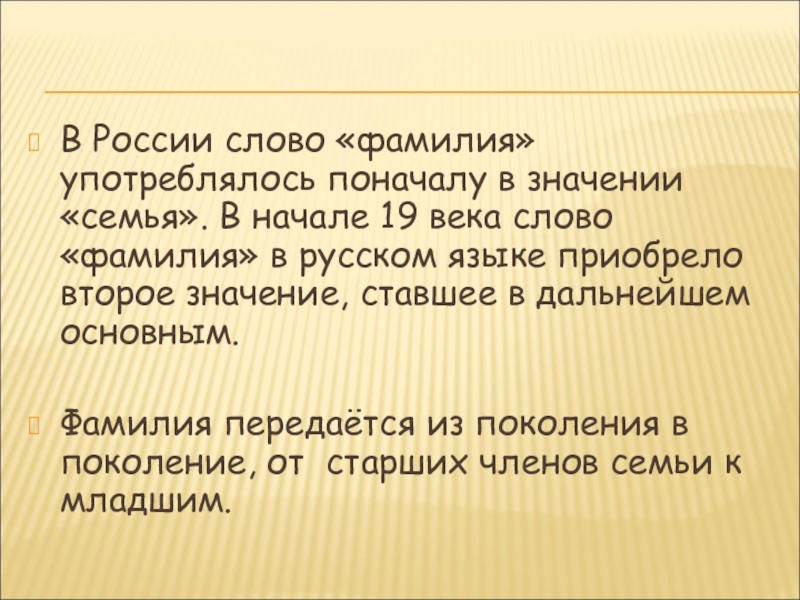 Слайд 4В России слово «фамилия» употреблялось поначалу в значении «семья». В начале