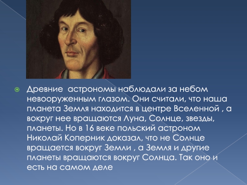 Слайд 7Древние астрономы наблюдали за небом невооруженным глазом. Они считали, что наша