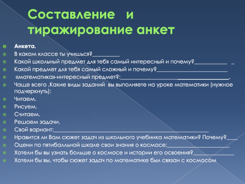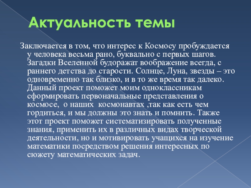 человека весьма рано, буквально с первых шагов. Загадки Вселенной будоражат воображение всегда, с раннего детства до старости. Солнце, Луна, звезды – это одновременно так близко, и в то же время так далеко. Данный проект поможет моим одноклассникам сформировать первоначальные представления о космосе, о наших космонавтах ,так как есть чем гордиться, и мы должны это знать и помнить. Также этот проект поможет систематизировать полученные знания, применить их в различных видах творческой деятельности, но и мотивировать учащихся на изучение математики посредством решения интересных по сюжету математических задач.