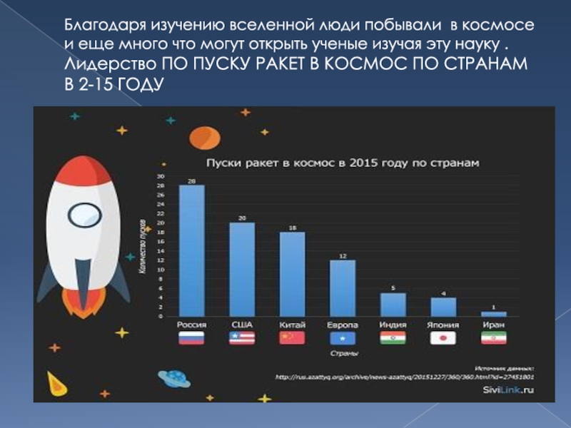 могут открыть ученые изучая эту науку .Лидерство ПО ПУСКУ РАКЕТ В КОСМОС ПО СТРАНАМ В 2-15 ГОДУ