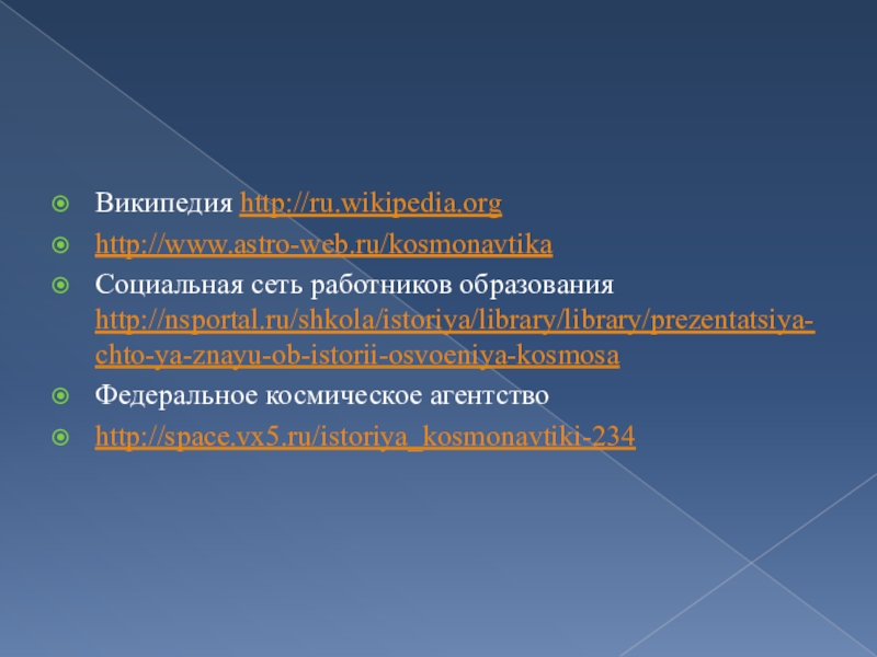 Социальная сеть работников образования http://nsportal.ru/shkola/istoriya/library/library/prezentatsiya-chto-ya-znayu-ob-istorii-osvoeniya-kosmosa