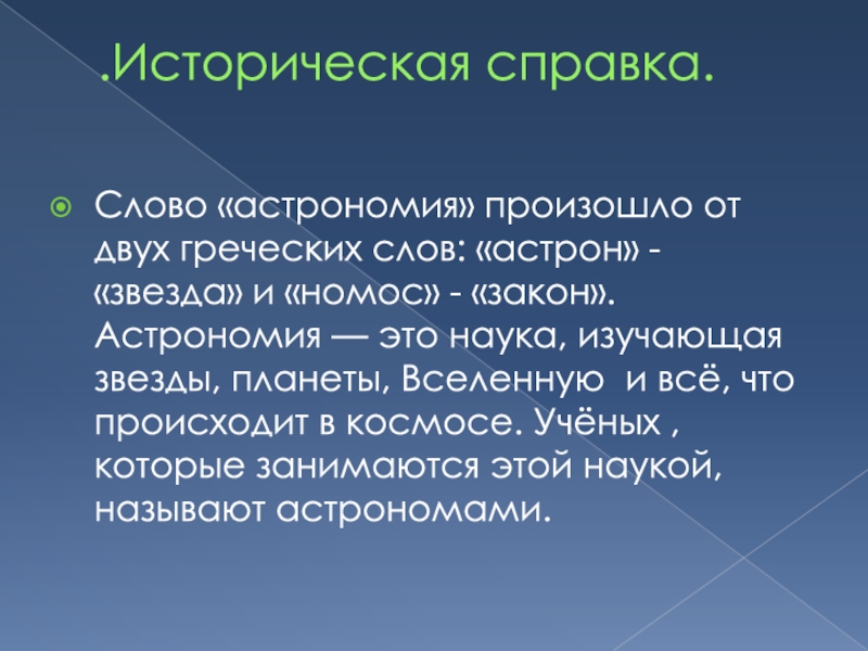 Слово «астрономия» произошло от двух греческих слов: «астрон» - «звезда»