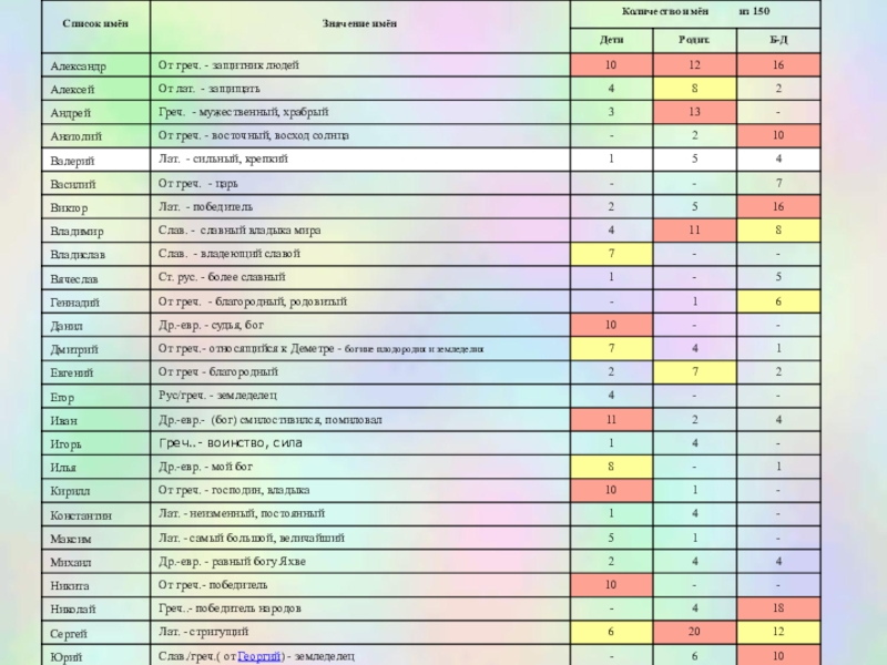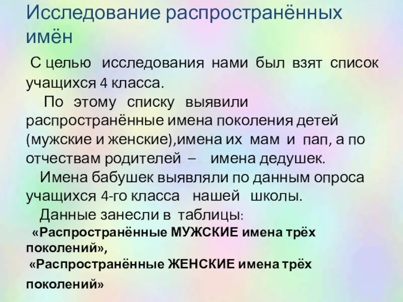 По этому списку выявили распространённые имена поколения детей (мужские и женские),имена их мам и пап, а по отчествам родителей – имена дедушек.