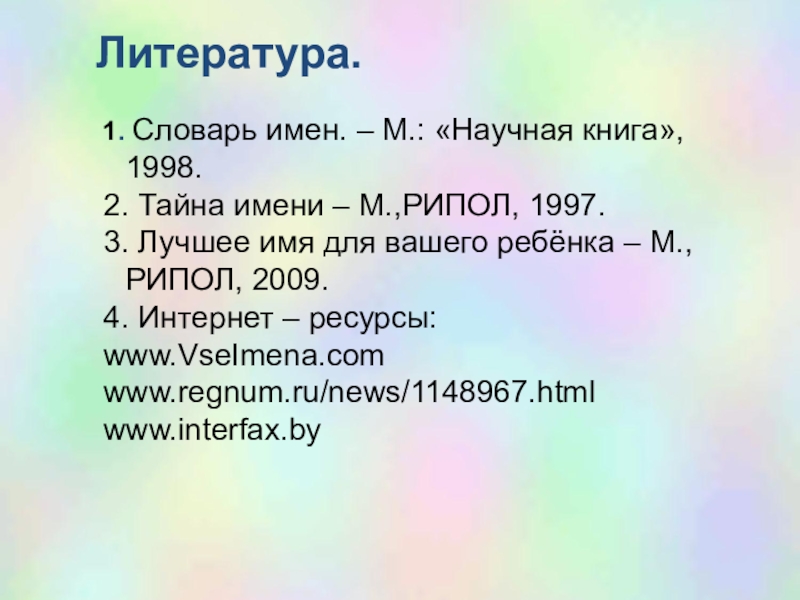 1. Словарь имен. – М.: «Научная книга», 1998.