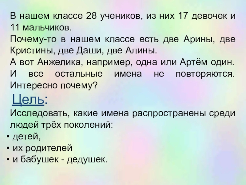 Почему-то в нашем классе есть две Арины, две Кристины, две Даши, две Алины.
