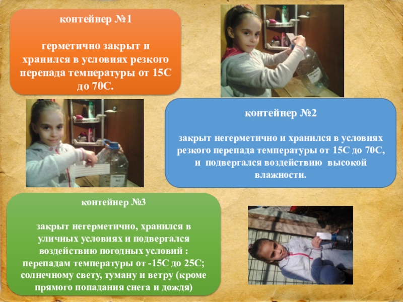 закрыт негерметично, хранился в уличных условиях и подвергался воздействию погодных условий : перепадам температуры от -15С до 25С; солнечному свету, туману и ветру (кроме прямого попадания снега и дождя)