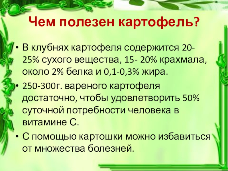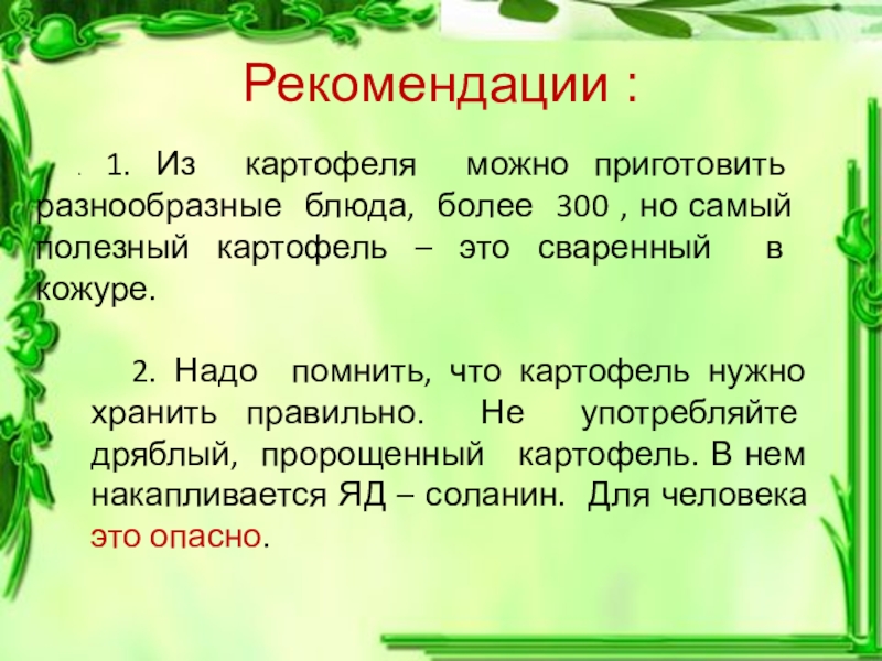 2. Надо помнить, что картофель нужно хранить правильно. Не употребляйте дряблый, пророщенный картофель. В нем накапливается ЯД – соланин. Для человека это опасно.