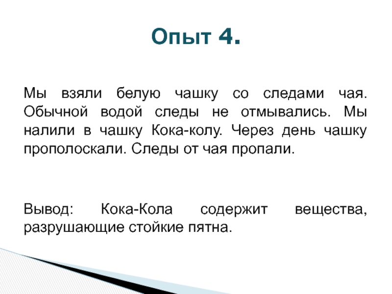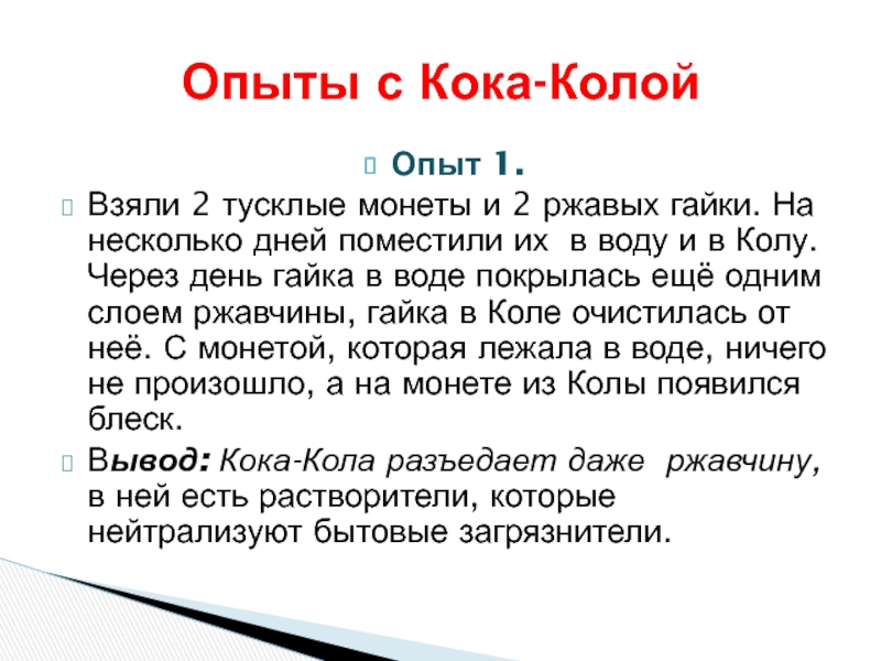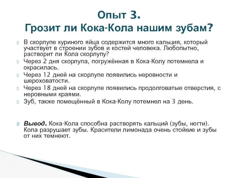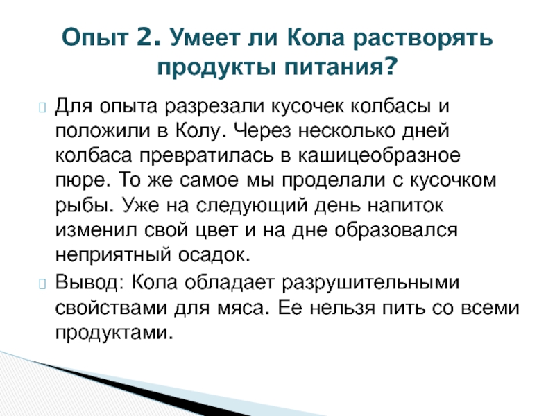 Опыт 2. Умеет ли Кола растворять продукты питания?