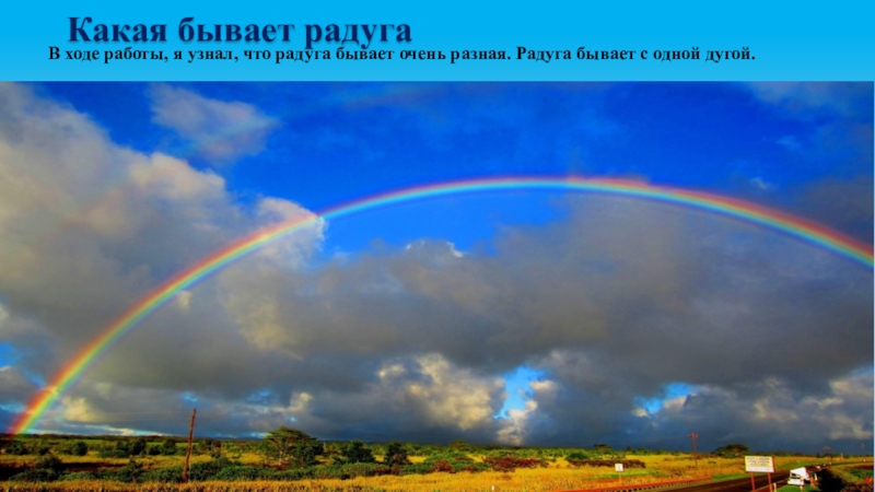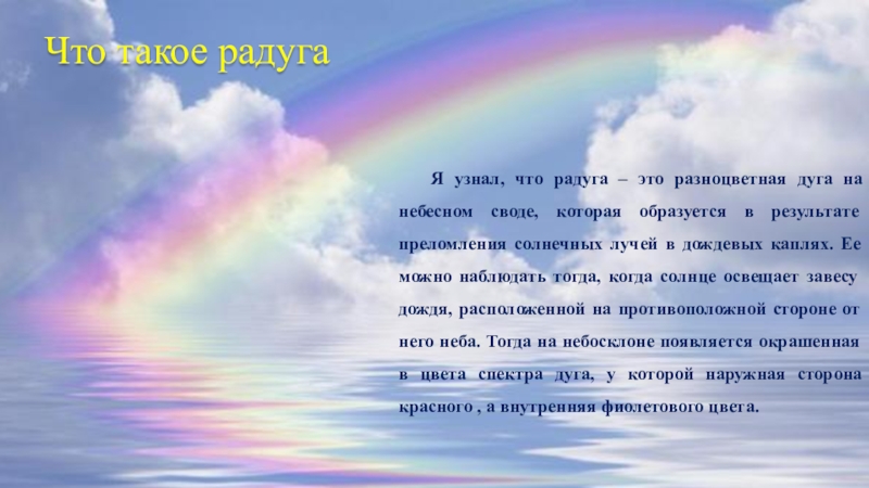 Я узнал, что радуга – это разноцветная дуга на небесном своде, которая образуется в результате преломления солнечных лучей в дождевых каплях. Ее можно наблюдать тогда, когда солнце освещает завесу дождя, расположенной на противоположной стороне от него неба. Тогда на небосклоне появляется окрашенная в цвета спектра дуга, у которой наружная сторона красного , а внутренняя фиолетового цвета.