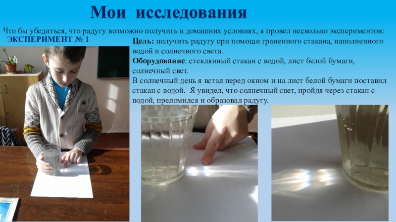 В солнечный день я встал перед окном и на лист белой бумаги поставил стакан с водой. Я увидел, что солнечный свет, пройдя через стакан с водой, преломился и образовал радугу.
