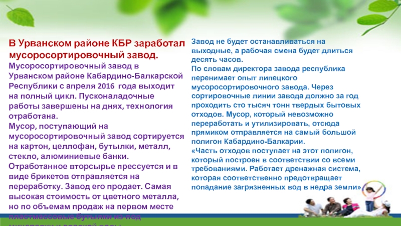 Слайд 35В Урванском районе КБР заработал мусоросортировочный завод.