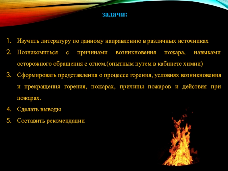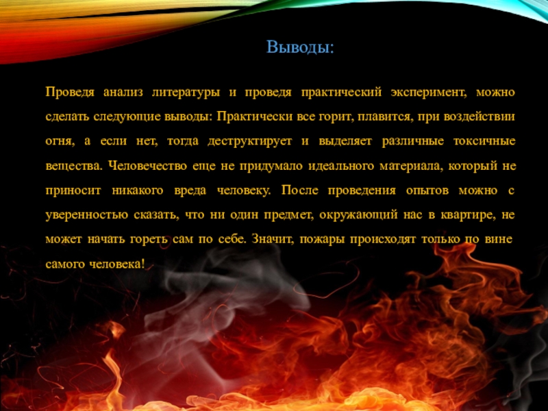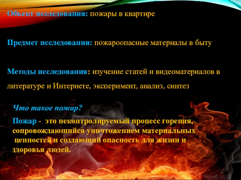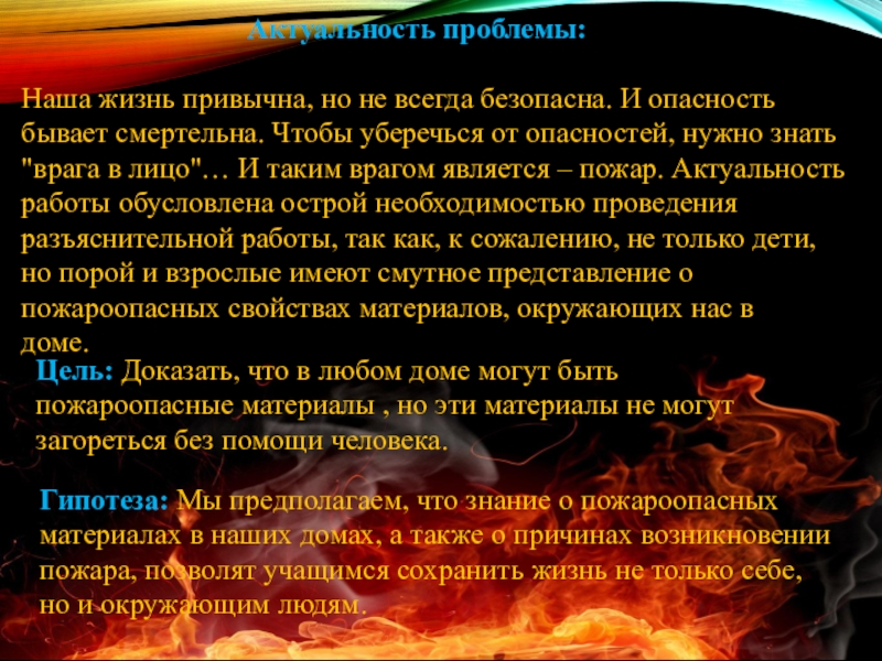 Гипотеза: Мы предполагаем, что знание о пожароопасных материалах в наших домах, а также о причинах возникновении пожара, позволят учащимся сохранить жизнь не только себе, но и окружающим людям.