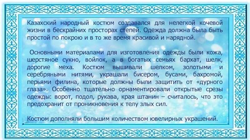 Слайд 11Казахский народный костюм создавался для нелегкой кочевой жизни в бескрайних просторах