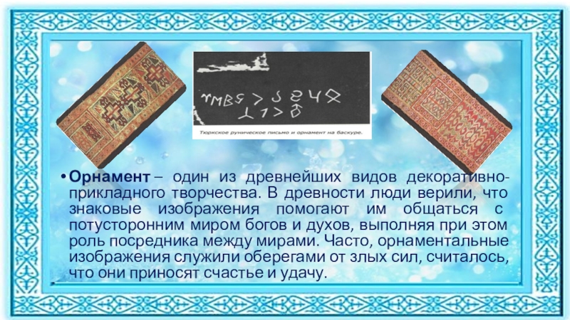 Слайд 7Орнамент – один из древнейших видов декоративно-прикладного творчества. В древности люди верили,