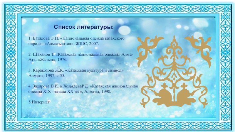 1. Баталова Э.Н. «Национальная одежда казахского народа» «Алматыкітап», ЖШС, 2007.