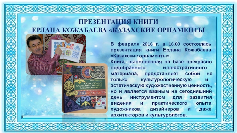 состоялась презентация книги Ерлана Кожабаева «Казахские орнаменты».
