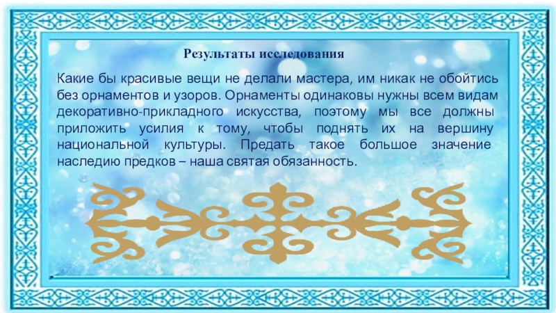 обойтись без орнаментов и узоров. Орнаменты одинаковы нужны всем видам декоративно-прикладного искусства, поэтому мы все должны приложить усилия к тому, чтобы поднять их на вершину национальной культуры. Предать такое большое значение наследию предков – наша святая обязанность.