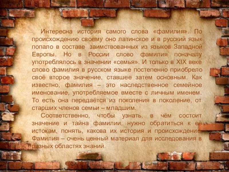 «ФАМИЛИЯ» - наследственное семейное именование, прибавляемое к личному имени – С.И.Ожегов. (Словарь русского языка)