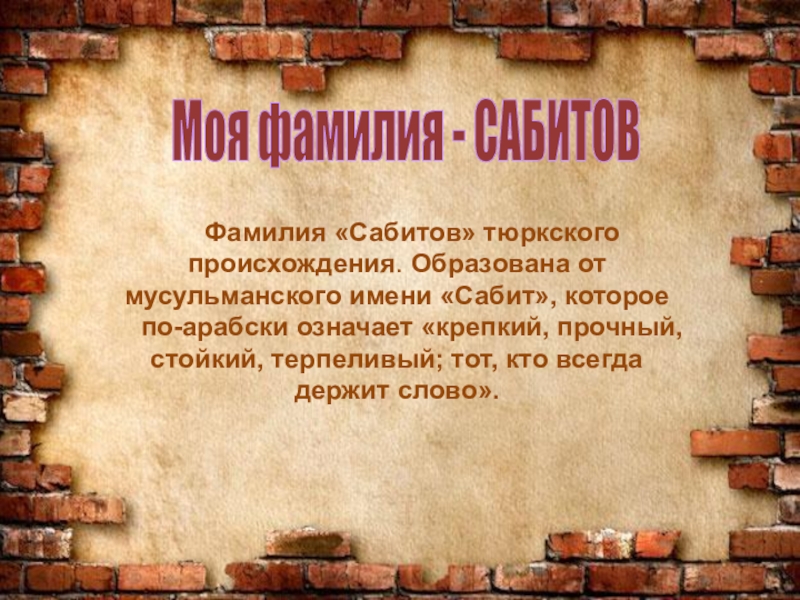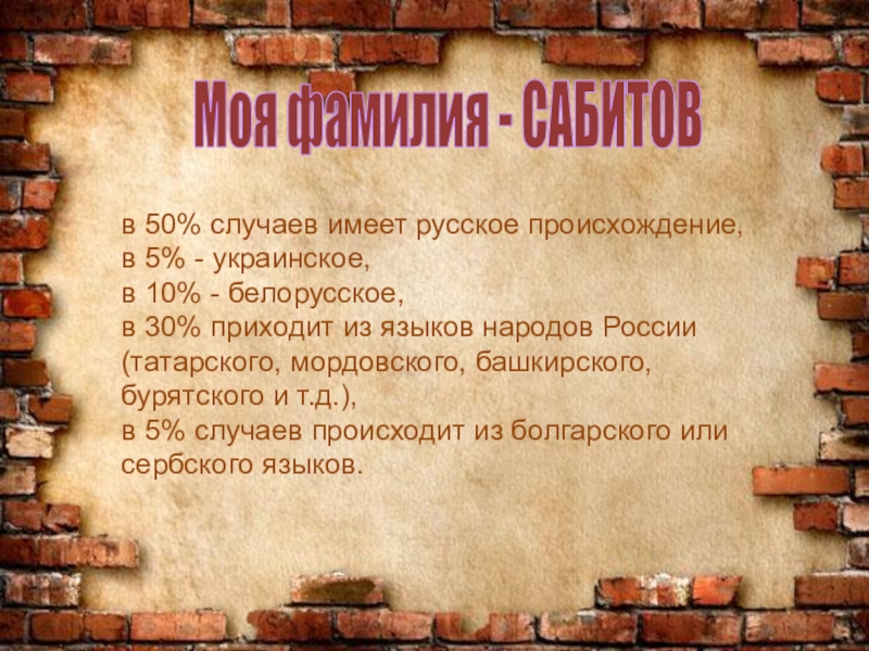 Изучить материал по истории происхождения фамилий на Руси и выяснить, что означает фамилия Сабитов.